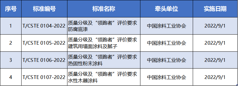 根据《中国技术经济学会团体标准管理办法》的有关规定,中国技术经济学会批准《质量分级及“领跑者”评价要求 防腐底漆》等四项团体标准。现予以发布,详细信息见下表: