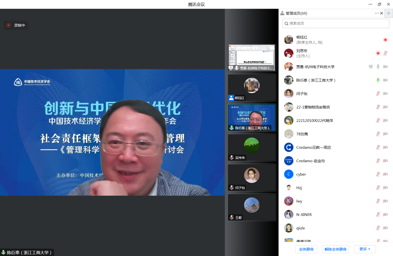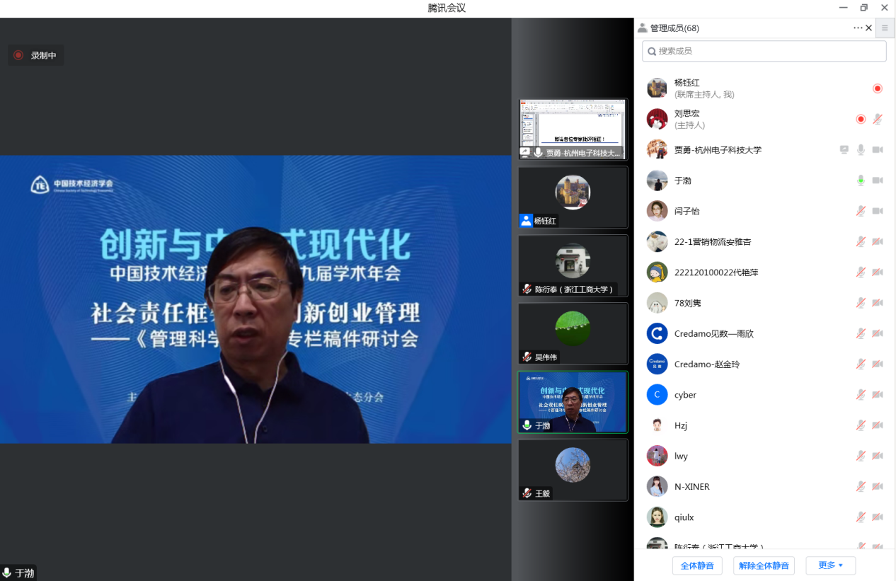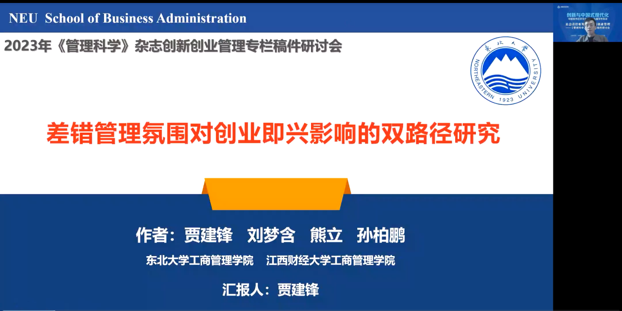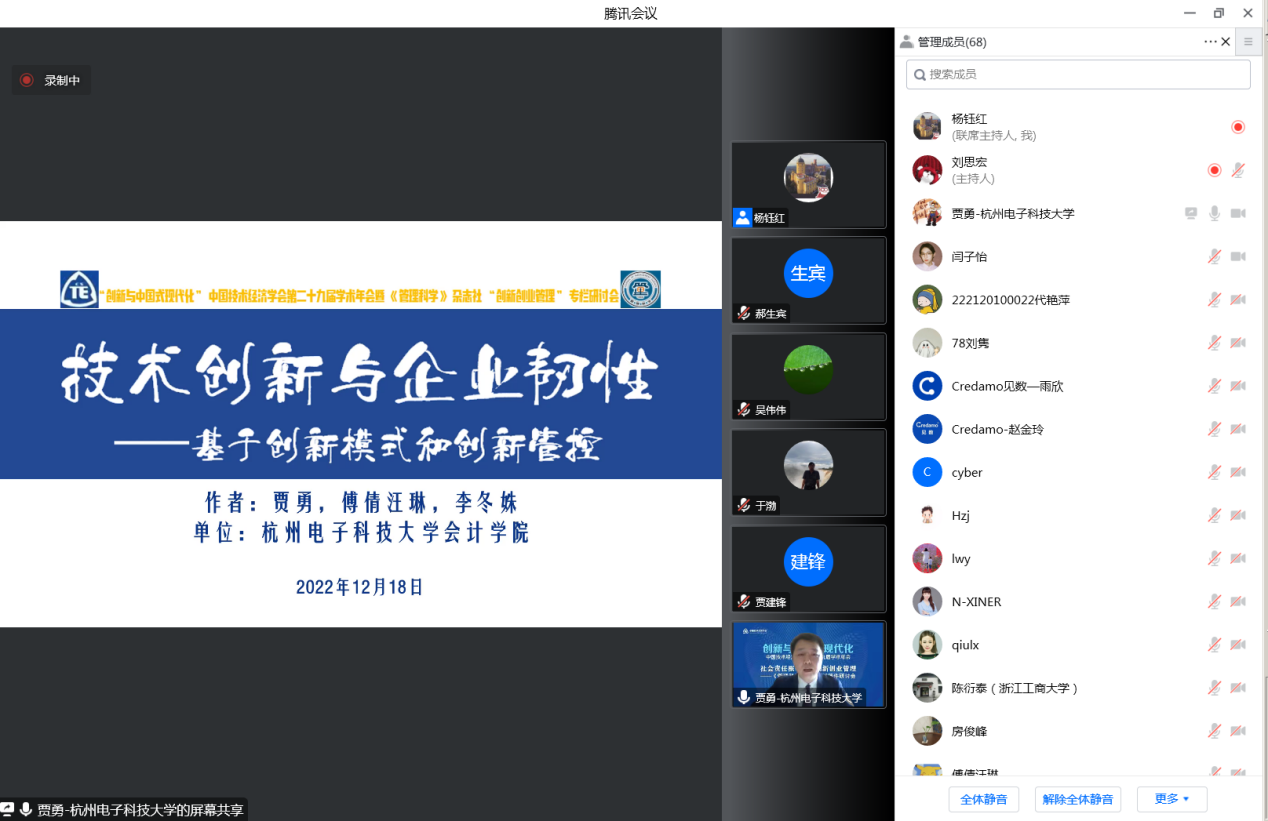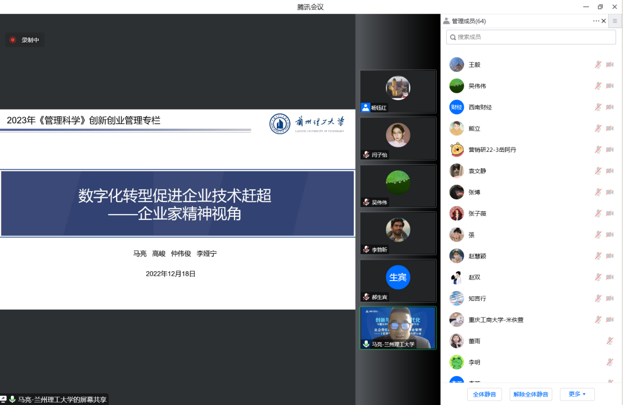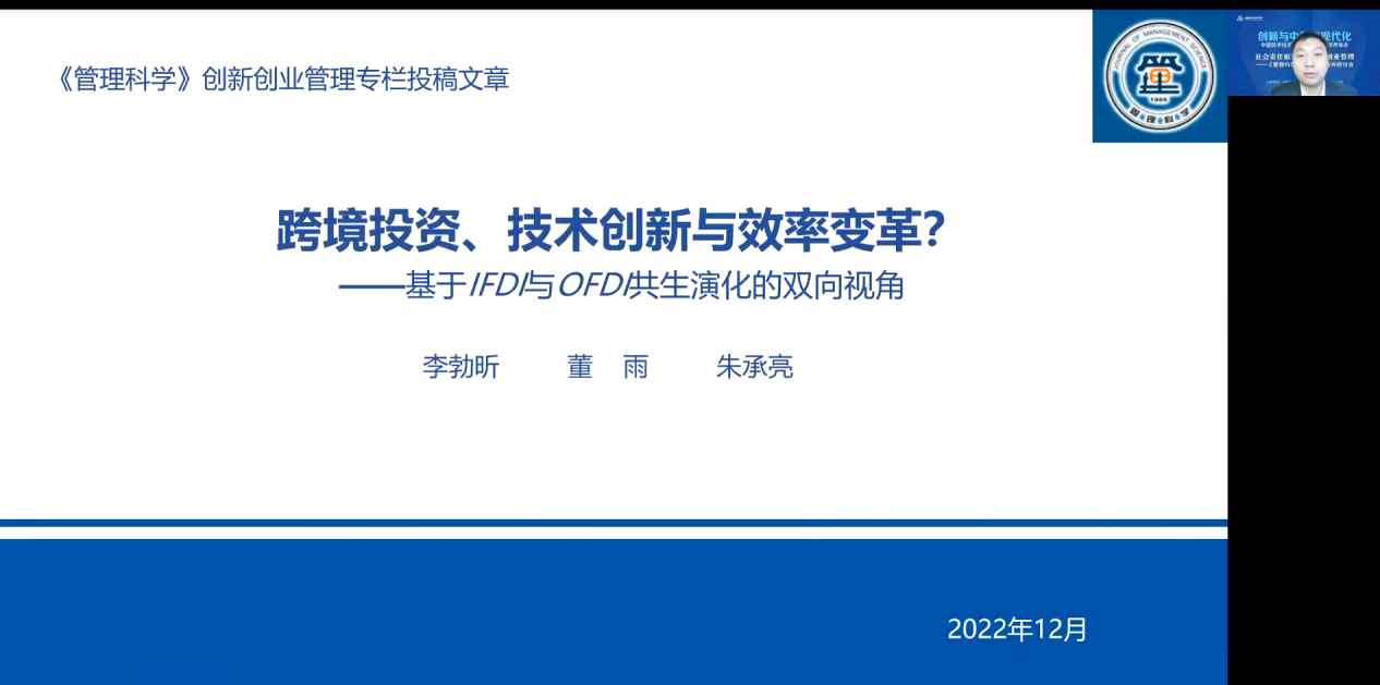 来自东北大学工商管理学院的贾建锋教授介绍了题为《差错管理氛围对创业即兴影响的双路径研究》的论文,杭州电子科技大学会计学院的贾勇博士介绍了《技术创新与企业韧性——基于创新模式和创新管控》,西安财经大学公共管理学院的李勃昕博士介绍了题为《跨境投资、技术创新与效率变革——基于IFDI和OFDI共生演化的双向视角》的论文,兰州理工大学经济管理学院的马亮博士介绍了题为《数字化转促进企业技术赶超——企业家精神视角》的论文。