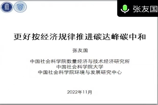 中国社会科学院数量经济与技术经济研究所副所长、环境技术经济分会理事长张友国研究员的演讲题目为《按规律积极稳妥推进碳达峰碳中和》,系统阐述了中国碳治理理论涵义、历史逻辑、现实逻辑,从按照经济规律视角认识和把握碳达峰碳中和工作内在规律,注重处理好4对关系,包括发展和减排的关系,体现了碳减排与经济发展相互作用的规律;整体和局部的关系,体现了碳减排工作中区域分工合作协同增效规律;长远目标和短期目标的关系,体现了降碳能力提升规律;政府和市场的关系,体现了碳减排中经济主体的行为规律。