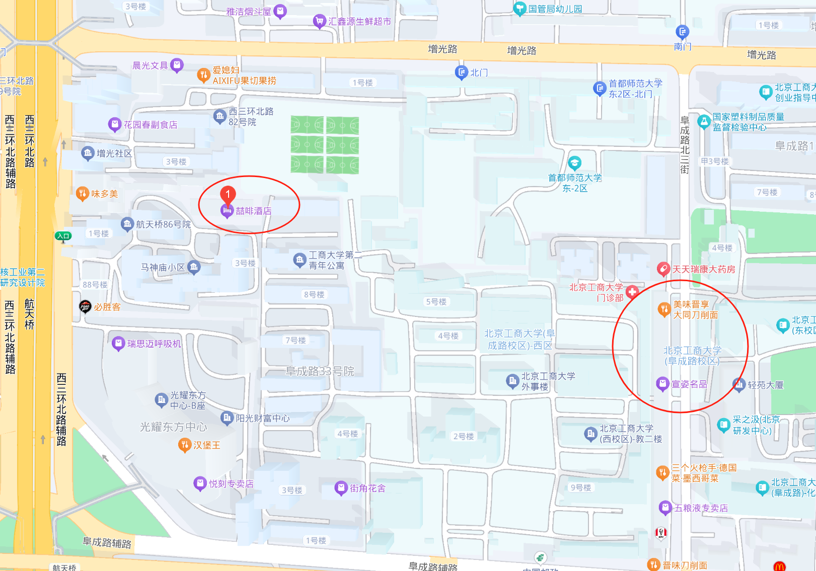 (2)喆啡酒店(首都师范大学航天桥店):距北京工商大学(阜成路校区)步行1.1公里。
