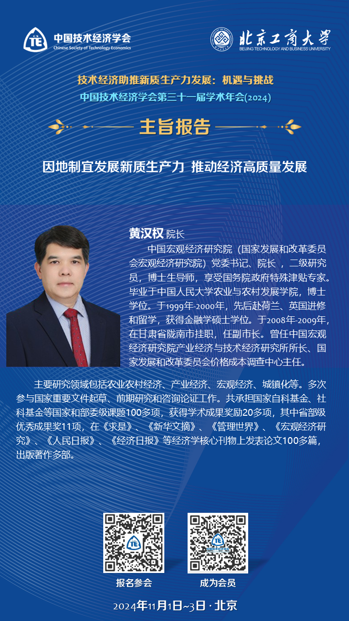 加快发展新质生产力,扎实推进高质量发展,为技术经济学科发展迎来重大机遇,同时也向中国技术经济学会和全国技术经济领域的科技工作者提出了新的工作目标、任务和挑战。为此,中国技术经济学会第三十一届学术年会以“技术经济助推新质生产力发展:机遇与挑战”为主题,于2024年11月1日——3日在北京召开。会议详情请见(第二轮通知链接 )。