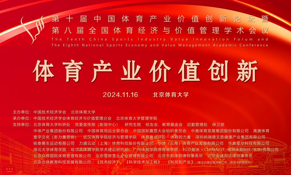 2024年11月16日,由中国技术经济学会和北京体育大学联袂主办,中国技术经济学会体育经济与价值管理分会、北京体育大学管理学院承办的“第十届中国体育产业价值创新论坛暨第八届全国体育经济与价值管理学术会议”在北京体育大学成功举办。