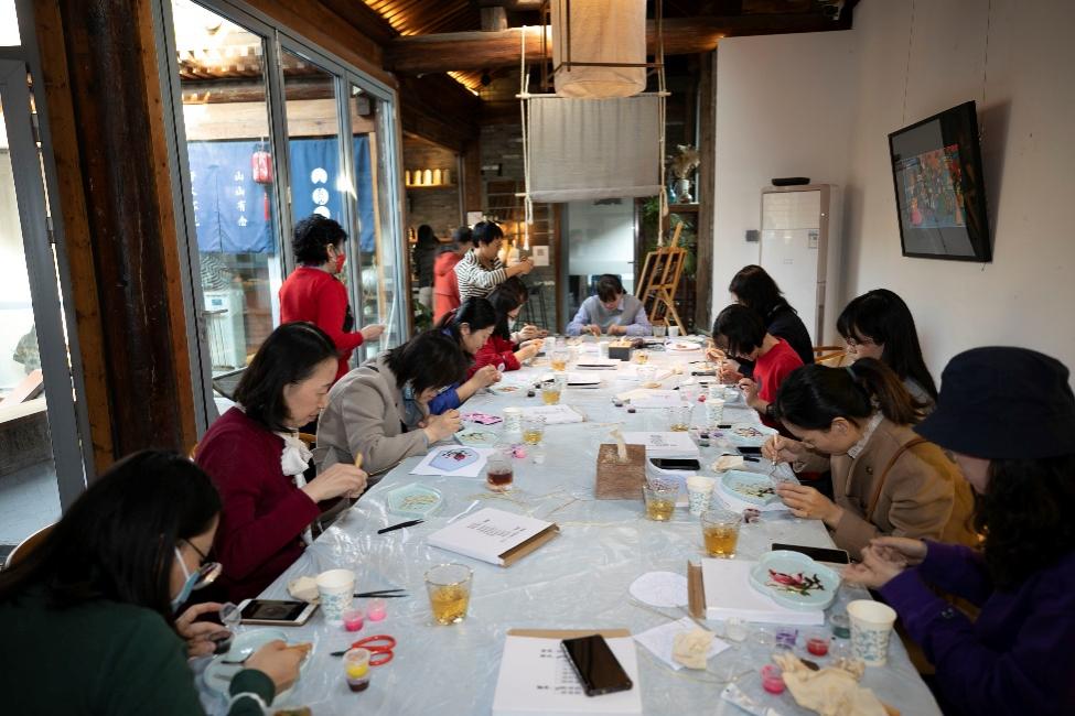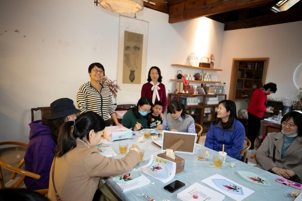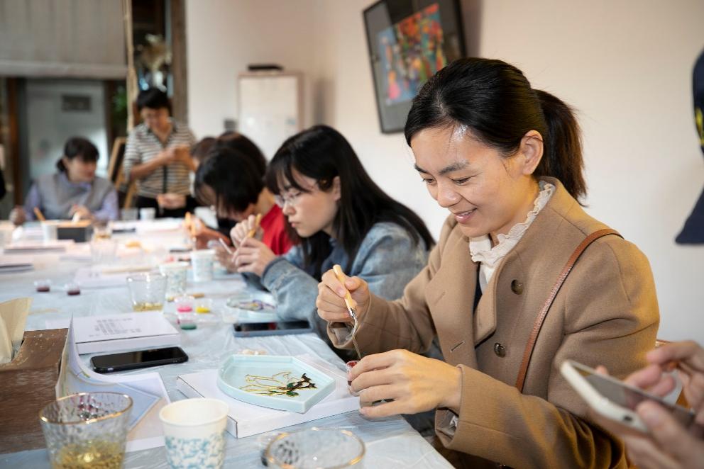在接下来的主题活动中,大家体验了珐琅掐丝工艺的DIY制作。专业老师为大家讲解了珐琅掐丝工艺的背景文化以及制作流程,并亲自指导大家完成作品,活动过程中每一位都积极投入,体验捋丝、剪丝、掐丝、上色、平整处理、固定画面等基本的手艺。活动结束后,一件件令人赏心悦目的珐琅画工艺盘完成,大家对自己的作品爱不释手,活动现场洋溢着欢声笑语。